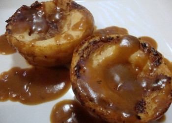 After 3 minutes, remove the muffin tin from the oven and immediately pour the batter, dividing evenly in each cup (about ⅓ of the way full). Place in the oven on a middle rack and set a timer for 35 minutes. Keep in mind that the puddings will have inflated only slightly and not in a dramatic fashion as their traditional egg-laden counterparts.