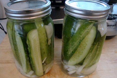 Pour the brine over the cucumbers, submerging them completely. Cover tightly. Refrigerate for a minimum of 72 hours, but the longer they “pickle”, the better. Enjoy!