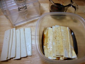 Press the tofu to remove as much water as possible. Blot the surface dry and then cut ⅛-inch thick slices lengthwise.