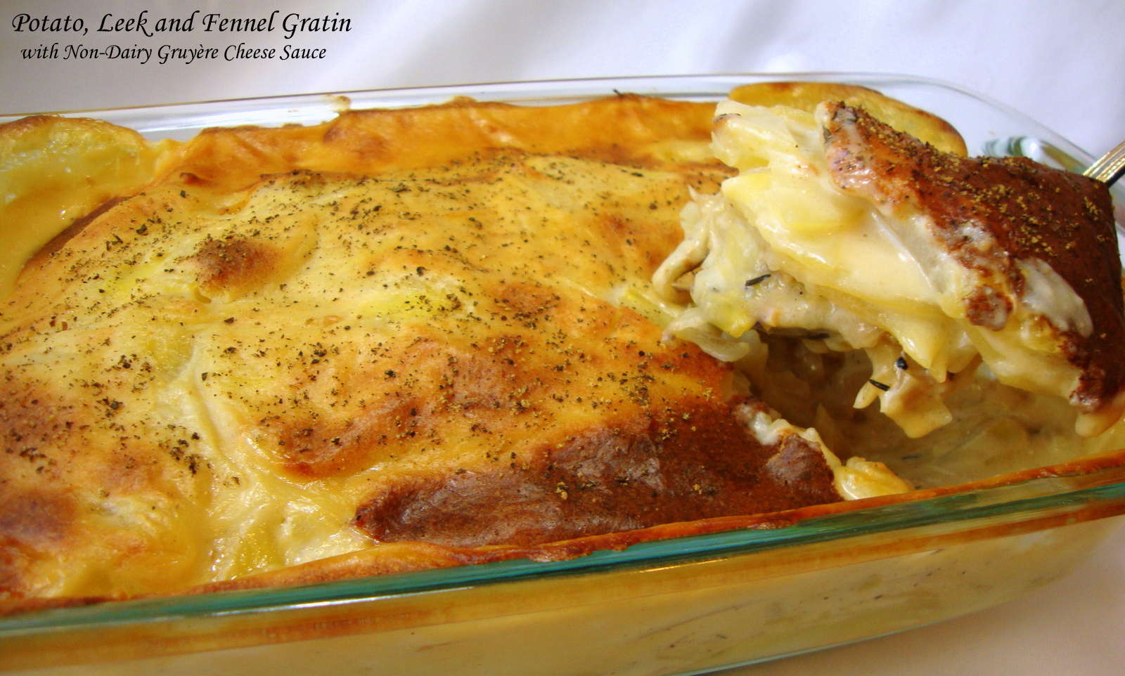 Sliced Yukon gold potatoes, fennel bulb and chopped leeks are bathed in a rich non-dairy Gruyère-style cheese sauce and baked until browned and bubbly.