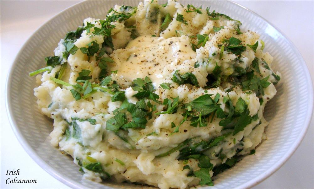 Colcannon is a traditional Irish dish consisting of creamy, buttery mashed potatoes and tender cooked kale seasoned with green onions, salt, pepper and parsley.