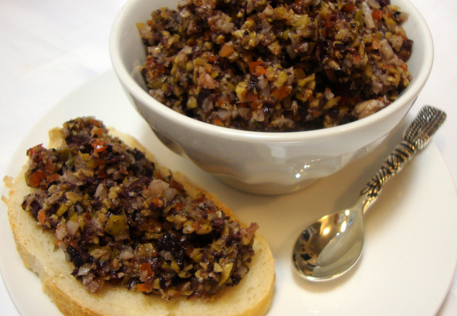 This recipe is my version of the mixed olive tapenade served on the famous New Orleans Muffuletta sandwich. Its bold Mediterranean flavors also pair well with hummus and baba ghannouj on crackers and crusty bread. Or try it on grilled eggplant sandwiches. Ideally it should be made a day in advance to give the flavors time to blend. Stored in an airtight container in the refrigerator, this spread will last for months.