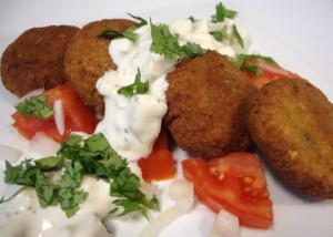 Form the chickpea mixture into balls about the size of walnuts and then gently press to flatten into small patties. The mixture will be moist and some will stick to your fingers, so keep a moist towel on hand while you work. Place the patties on a plate or cutting board.