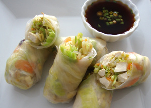 Just about any filling can be used for Spring rolls. Raw, steamed or lightly sautéed vegetables should be coarsely chopped or sliced into thin slivers. Fresh herbs are wonderful to use in Spring rolls as well. Try my Soy Ginger Dipping Sauce (recipe follows) for dipping your rolls.