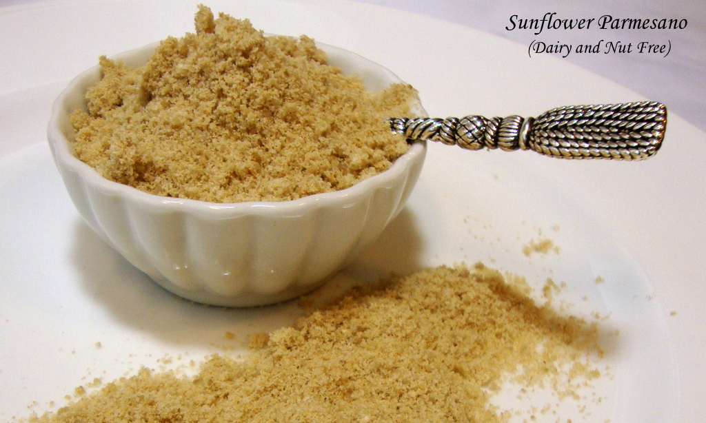 Sunflower Parmesano is prepared from sunflower seeds and is a tasty alternative to grated dairy Parmesan for those abstaining from dairy products and for those who cannot consume tree nuts due to allergies. It has a granular texture reminiscent of a grated dairy Parmesan and Romano cheese blend. While it lacks the pungent aroma of its dairy counterparts, it has its own unique identity and savory flavor. Because Sunflower Parmesano is made with miso, a fermented product or “living” food, the flavor will continue to develop during refrigeration. It will also stay fresh in the refrigerator for several weeks or more if stored in an airtight container.