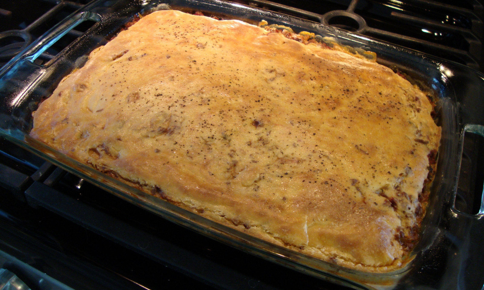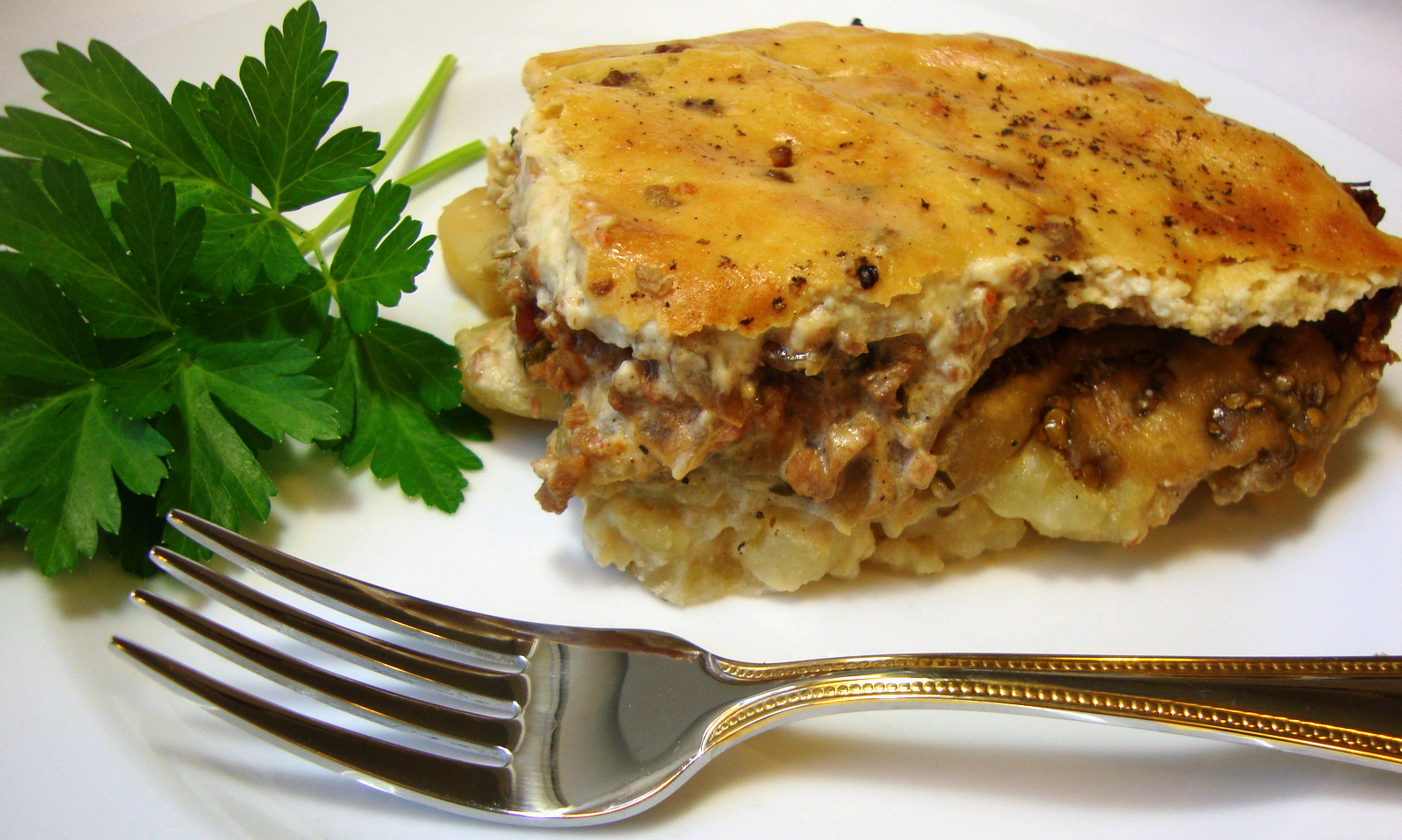 Spread the meatless meat mixture over the eggplant and top with the remaining Béchamel sauce. Season with a little coarse ground black pepper and bake for 50 to 60 minutes or until golden brown on top.