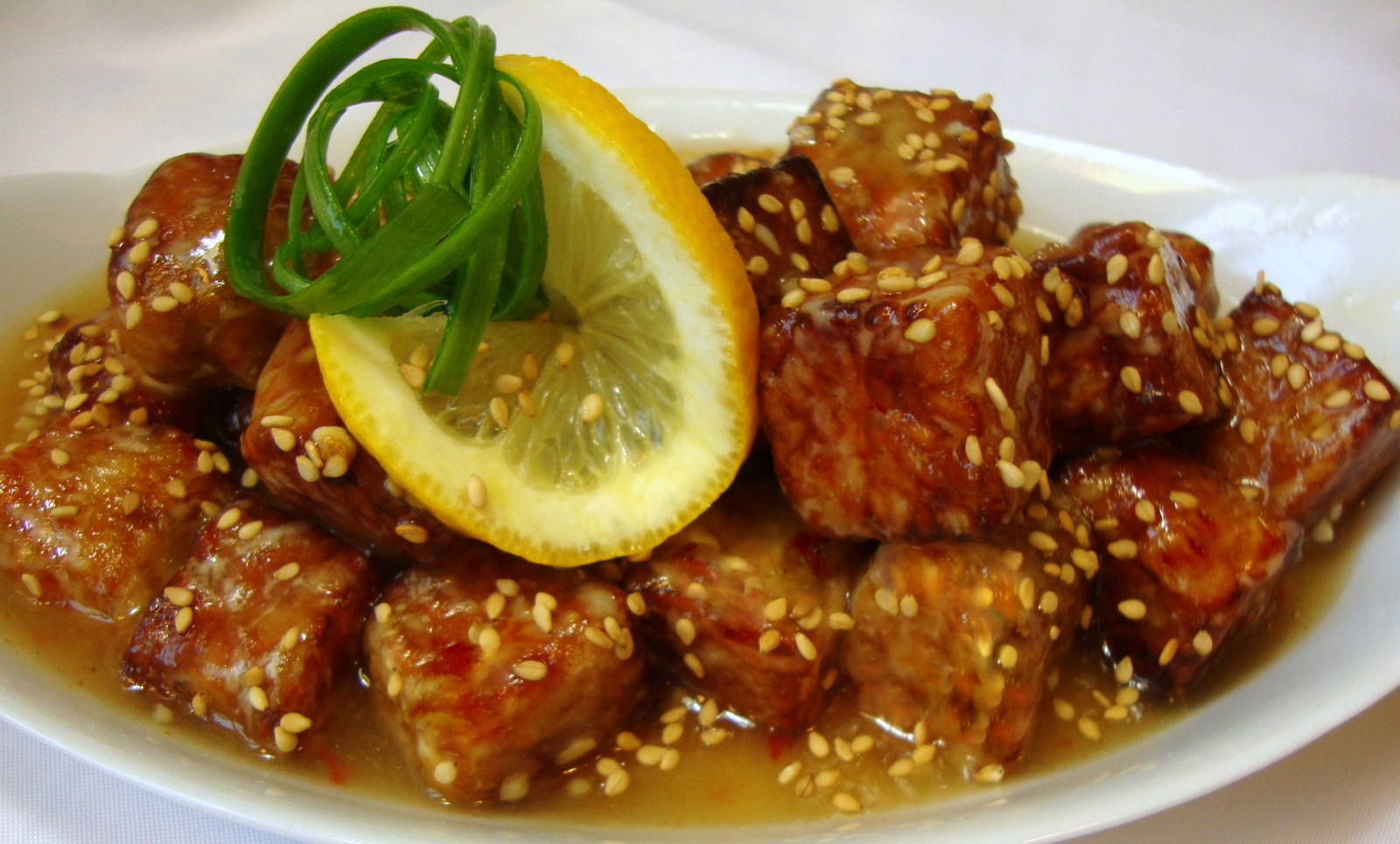 Add the fried tempeh to the lemon sauce and toss gently to coat. Serve immediately and sprinkle with the toasted sesame seeds.