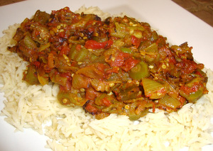 Bhindi masala is a very popular Indian dish consisting of spiced okra, onions and tomatoes. Okra is a powerhouse of nutrition due to its high soluble fiber, vitamin C, and folate content. It’s also high in antioxidants and a good source of calcium and potassium. Okra contains a large amount of mucilage: a slimy substance which is responsible for its high soluble fiber content. This gooey mucilage is very evident when okra begins cooking but dissolves when thoroughly cooked and mixed with the acidity of the tomatoes.