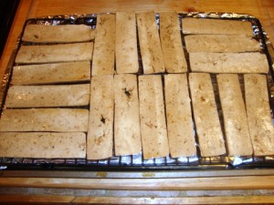Press the tofu to remove as much water as possible. Blot the surface dry and then cut ⅛-inch thick slices lengthwise.