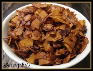 Remove from the oven and stir the flakes, again redistributing them in a single layer. This process will need to be repeated every 5 minutes for a total of about 15 minutes for slightly chewy bacun bits, or 20 minutes for crispy bacun bits.