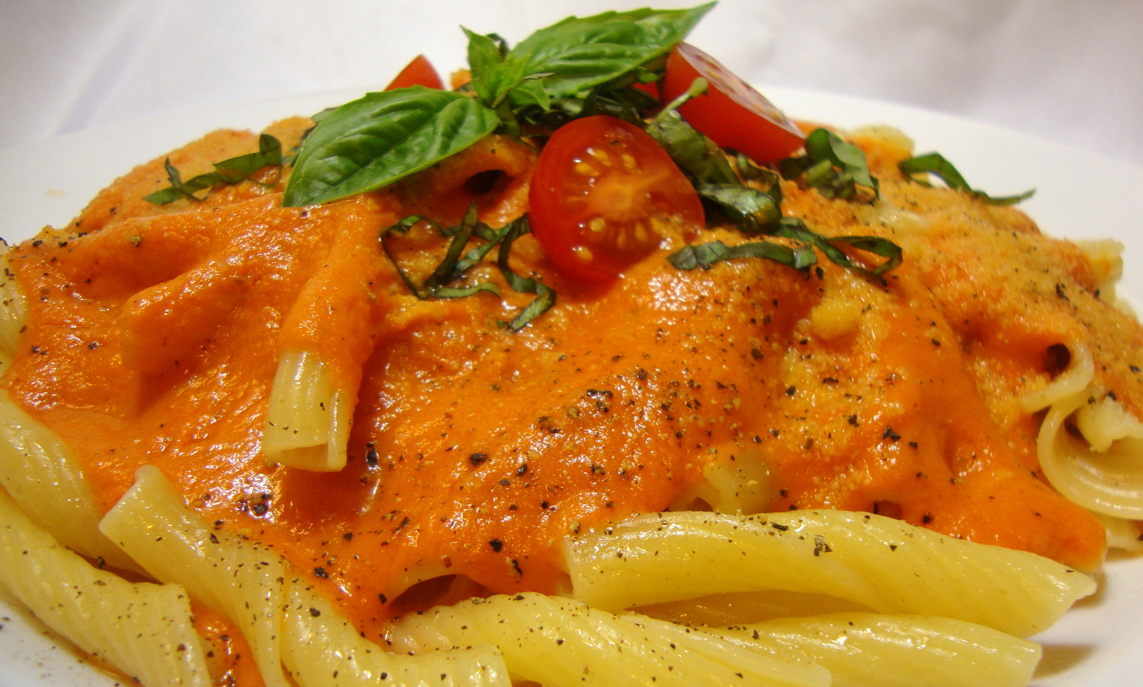 Stir in the cashew or soy cream and cook until heated through. Season the sauce with additional salt as needed to taste. Ladle the sauce over cooked pasta, sprinkle with parmesan and fresh ground black pepper and garnish with the optional fresh basil.