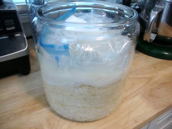 Place the water-filled bag into the jar on top of the cheesecloth. The weight of the bag will keep the mass of cabbage completely submerged in the brine during fermentation. If the cabbage is submerged completely, no undesirable mold blooms will occur. Seal the top of the jar with plastic wrap to prevent evaporation of the brine.