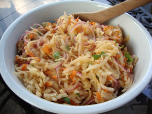 Jicama (pronounced hik-uh-mah) is a large, bulbous root vegetable, weighing one to two pounds. Jicama has a rough brown skin which needs to be peeled before eating. The flesh is white, wet and crunchy, similar to a raw potato but with a slightly sweet and nutty flavor. This refreshing slaw is ideal for cooling the heat of spicy Mexican, Indian or Thai cuisine or simply as a side dish on a hot Summer day.