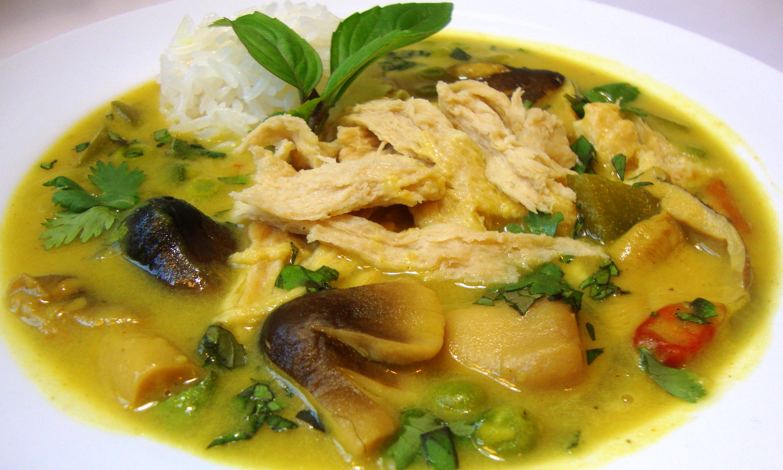 Add the Stewing Chikun and simmer an additional 10 minutes; season with salt to taste. If using Shredded Chikun, stir into the curry just before serving. Garnish with the Thai basil and cilantro.