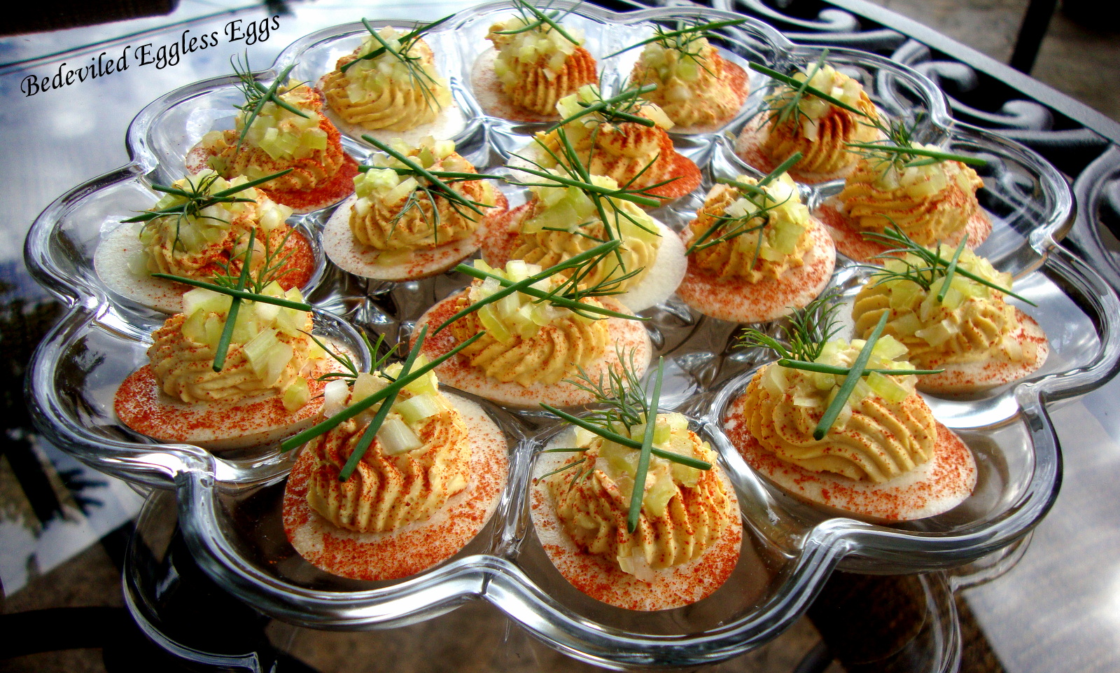 Bedeviled eggless eggs are remarkably similar to deviled eggs in appearance, taste and texture. They make the perfect bite-size finger food for BBQs, picnics and parties. Kala namak, or Himalayan black salt, is essential to impart that familiar egg-like taste to these savory bites.