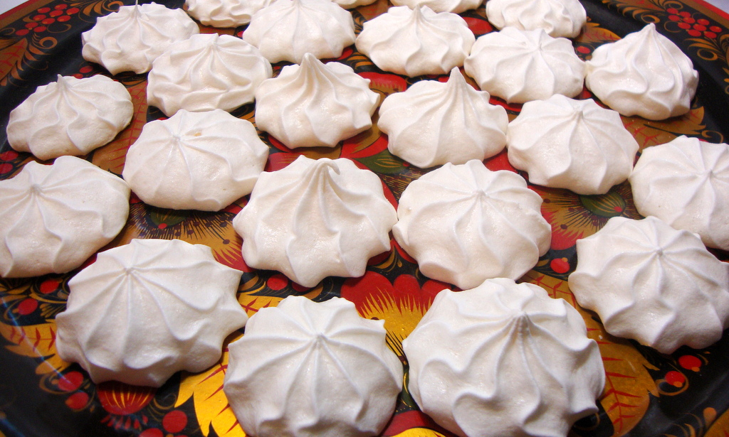 Drop the meringue by teaspoonful, about 1-inch in diameter, onto a baking sheet lined with either parchment paper or a silicone baking mat (e.g., Silpat™). Alternately, the mixture can be decoratively piped onto the baking sheet using a pastry bag. Don’t spread the drops too far apart or you won’t be able to fit 24 onto a single sheet. Repeat on the second baking sheet.