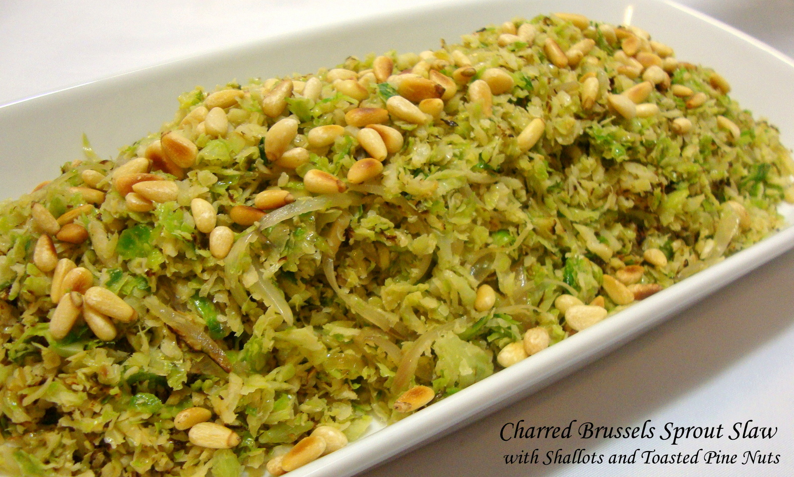 Add the slaw and a pinch or two of salt. Increase the heat to medium-high. Stir the mixture occasionally. The goal is to slightly char or caramelize the vegetables just a bit. If the vegetables seem dry, add another tablespoon or two of non-dairy butter, margarine or olive oil, if desired. Cook until the slaw is tender crisp. Season the slaw with black pepper to taste and add additional salt as desired. Sprinkle with the toasted pine nuts and serve immediately.