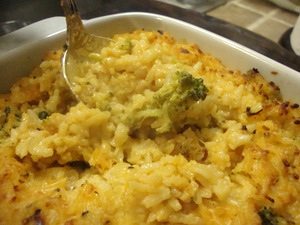 Uncover the casserole dish, set the oven on broil and lightly brown the top of the cheesy rice mixture under the broiler, about 5 minutes. Serve immediately.